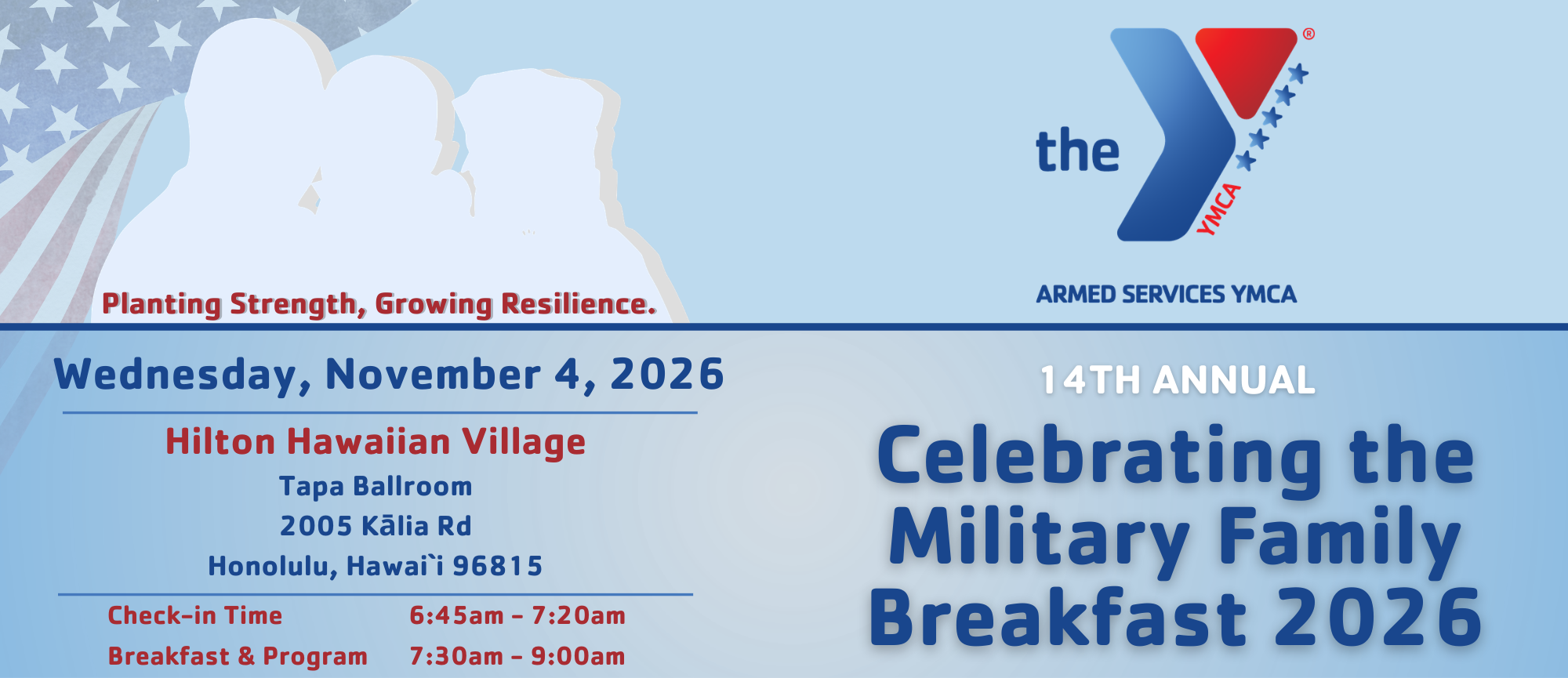The Armed Services YMCA (ASYMCA) is honored to host the 14th annual “Celebrating the Military Family” breakfast event on Wednesday, November 4, 2026 at the Hilton Hawaiian Village’s Tapa Ballroom.