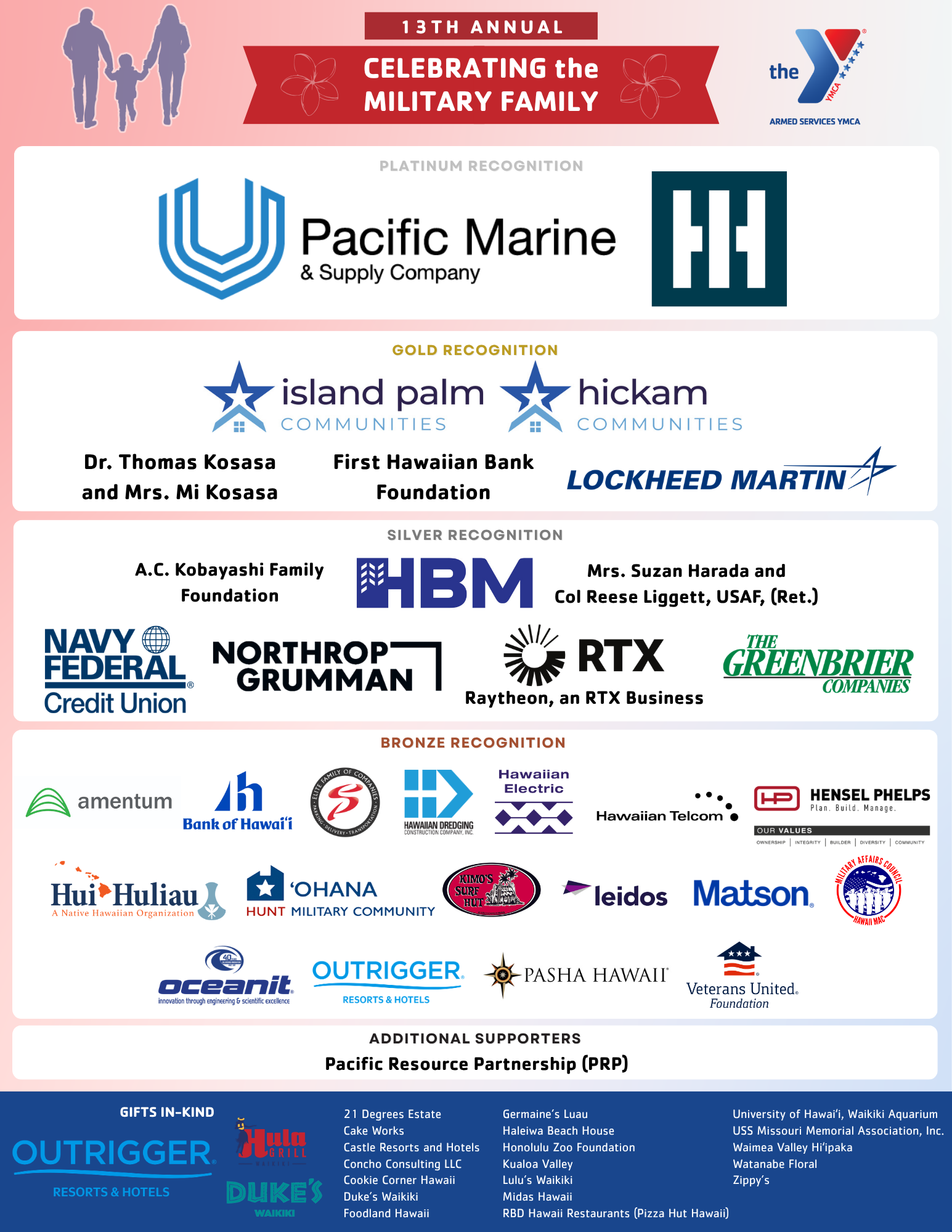 Your generosity extends beyond the morning of the event and helps continue our legacy of service and support for Hawaii’s service members; offering resilience, hope, and assistance in times of need. We would love to hear from you if you're interested in participating in Celebrating the Military Family in any capacity. Please contact us at (808) 448-1972, KTaniguchi@asymca.org, or KSablan@asymca.org.
