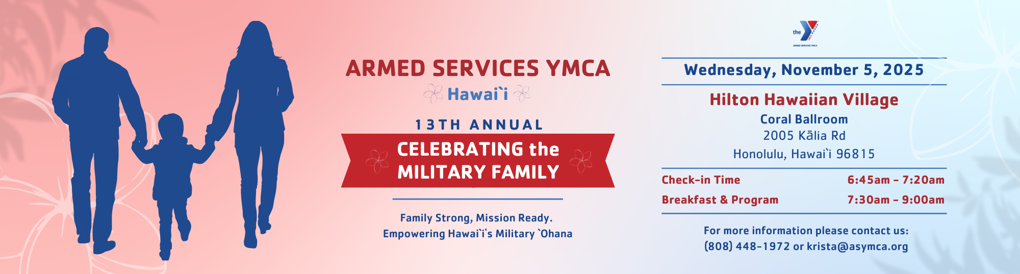 The Armed Services YMCA (ASYMCA) is honored to host the 13th annual “Celebrating the Military Family” breakfast event on Wednesday, November 5, 2025 at the Hilton Hawaiian Village’s Coral Ballrooms.